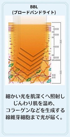 シミ、ニキビ、肌のたるみ、バストアップなど、フェイシャルだけでなく全身のスキンケアに効果が期待できます。従来のフォトフェイシャル(IPL)の5倍の美容効果があるといわれており、コラーゲンを自力で生成する力を活性化させ、肌のターンオーバーを促し美肌へと導きます。